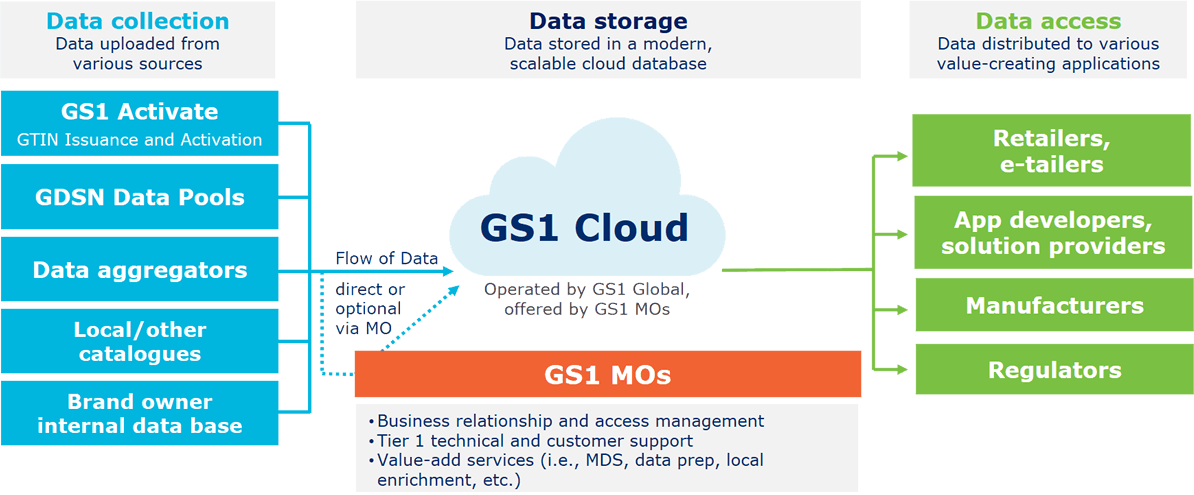 GS1 Cloud kombinon informacionin mbi të dhënat e produkteve nga burime të ndryshme ekzistuese, nga bazat e të dhënave ekzistuese GS1 (të tillë si GDSN, GEPIR dhe katalogët lokalë të produkteve të mirëmbajtura nga organizata anëtare GS1).
